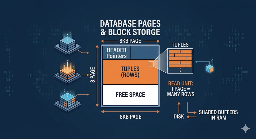 Khi mình muốn database đọc một bản ghi, nó thường làm việc với cả page/block chứa bản ghi đó, chứ không chỉ đọc đúng một dòng duy nhất từ ổ đĩa. Vì vậy, hiệu năng truy vấn không chỉ phụ thuộc vào số dòng, mà còn phụ thuộc vào số lượng page/block phải đọc(scan), cách dữ liệu được sắp xếp, và việc có dùng cache hay không, hay phải trực tiếp truy cập ổ đĩa (disk) để load toàn bộ page lên RAM (Shared Buffers), rồi mới lấy được bản ghi đó ra.