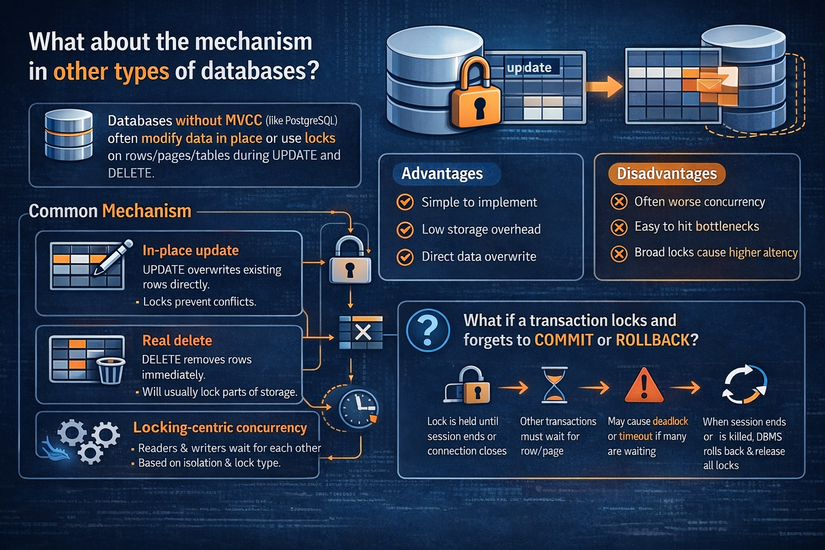 Tổng quát thì nhiều database không dùng cơ chế MVCC như Postgresql thì sẽ thường xử lý UPDATE và DELETE theo hướng sửa dữ liệu tại chỗ hoặc khoá hàng/trang/bảng trong lúc sửa.