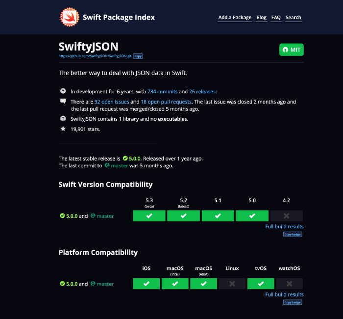 Phần tốt nhất của Swift Package Index là nó cho bạn thấy mức độ hoạt động của một dự án và khả năng tương thích phiên bản của nó trong một chế độ xem ngắn gọn.