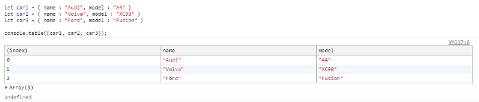 console.table([car1, car2, car3]);