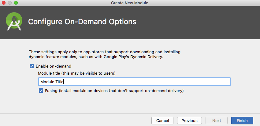 Tại đây, bạn có thể tạo các module cơ sở cho ứng dụng của bạn. Nếu ứng dụng của bạn hỗ trợ Android 4.4 trở về trước thị bạn cũng cần bật Fusing, vì điều này sẽ làm cho module tính năng động của bạn có sẵn cho các thiết bị này dưới dạng nhiều APK.