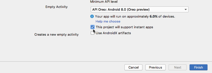 Nếu bạn đang bắt đầu một dự án mới, thì bạn sẽ gặp may mắn: bạn có thể tạo một dự án trống đã có cấu trúc Instant Apps. Chỉ cần tạo một dự án mới như bình thường, nhưng khi được nhắc, hãy chọn Dự án này sẽ hỗ trợ các ứng dụng tức thì.