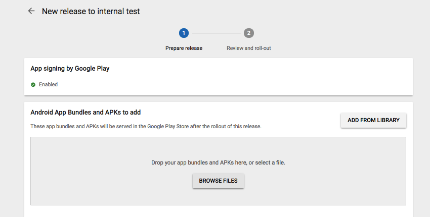 Khi được nhắc, hãy đăng ký Đăng ký ứng dụng bằng Google Play, đây là điều bắt buộc để sử dụng định dạng Gói ứng dụng. Chọn Browse files và sau đó chọn tệp .aab mà bạn muốn tải lên.