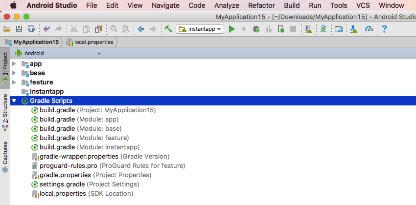 - Instantapp module: Đây là một thùng chứa mà cuối cùng sẽ đưa từng mô-đun của dự án của bạn và chuyển đổi chúng thành Instant Apps.
