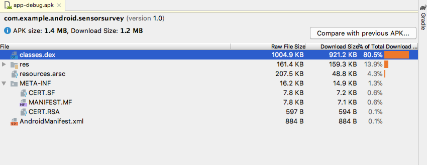 Bạn có thể xác định những thành phần có kích thước lớn nhất đối trong mình bằng cách sử dụng Trình phân tích APK của Android Studio. Công cụ này cho phép bạn biết kích thước tuyệt đối và tương đối của các loại tệp khác nhau và thậm chí kích thước của các tệp riêng lẻ.