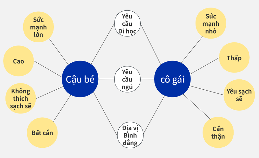 Biểu đồ bong bóng kép, một biến thể của biểu đồ bong bóng, có hai chủ đề trung tâm, phần kết nối đại diện cho các đặc điểm chung của cả hai và phần còn lại đại diện cho sự khác biệt giữa chúng. Chủ yếu được sử dụng để mô tả sự tương đồng và khác biệt giữa hai từ khóa trung tâm, được sử dụng để so sánh sự tương đồng và khác biệt giữa hai thứ. Mặc dù thành phần hình ảnh và biểu đồ bong bóng của nó rất giống nhau, nhưng có một sự khác biệt rất lớn giữa hành động và cảnh sử dụng. Chúng ta có thể giúp mình xây dựng hệ thống tri thức bằng cách so sánh các điểm tri thức cũ và mới thông qua biểu đồ bong bóng kép.