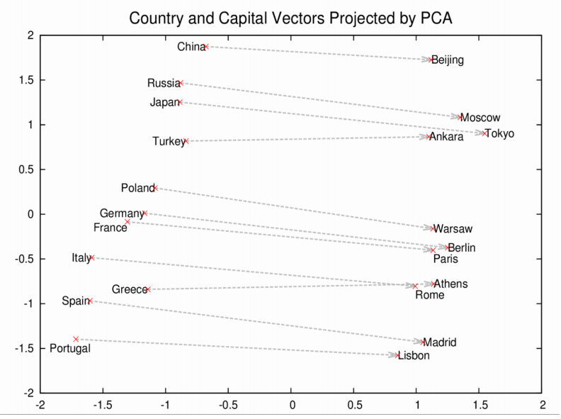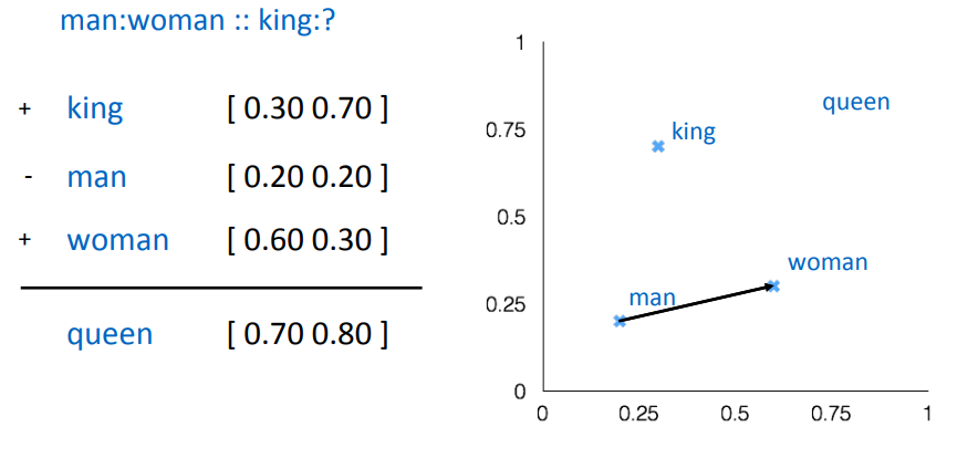 Chúng ta cùng phân tích qua một vài kết quả thú vị sử dụng mô hình word2vec. Ví dụ dưới đây là một ví dụ cực kỳ kinh điển của mô hình word2vec. Word vector học từ mô hình word2vec rất phù hợp để tìm ra quan hệ giữa các từ về mặt ngữ nghĩa. Chúng ta có thể tìm mối quan hệ giữa các từ thông qua các phép toán vector.