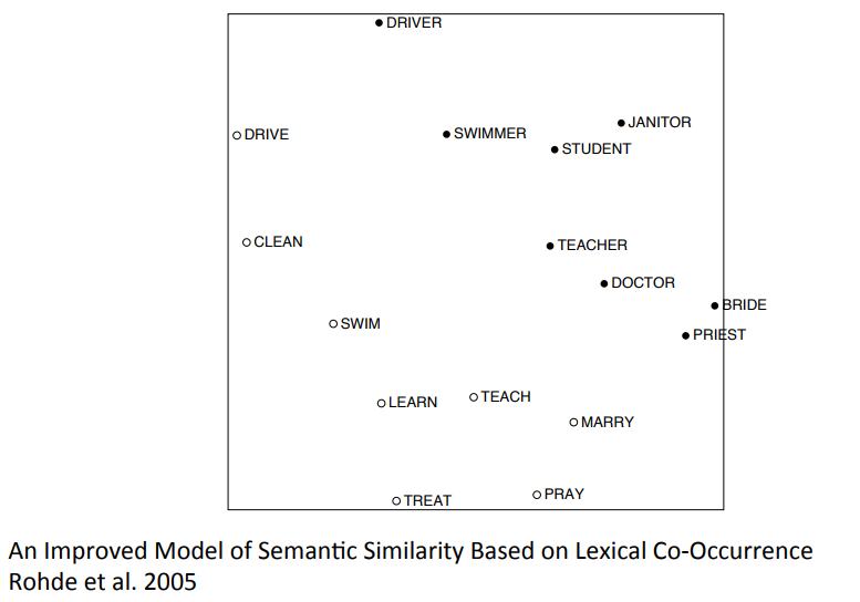 Hình ảnh ở trên là một ví dụ khác sử dụng ma trận đồng xuất hiện cho biểu diễn từ lên không gian vector. Như chúng ta đã thấy, kết quả khá tốt khi mối quan hệ giữa các danh từ và động từ được tách biệt 1 cách khá rõ ràng.