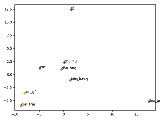 Để có cái hình dung dễ hơn về sự tương đồng ngữ nghía giữa các từ, ở đây mình load lại 2 mô hình vừa train ở trên là visualize lên không gian 2 chiều. Các từ được visualize bao gồm: tôi, phụ nữ, đàn ông, em, con gái, con trai, thời gian, tiền bạc.