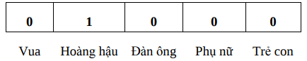 Ví dụ: Giả sử bộ từ vựng của chúng ta chỉ có 5 từ: Vua, Hoàng hậu, Phụ nữ, Đàn ông và Trẻ con. Ta sẽ mã hóa cho từ Hoàng Hậu như sau: