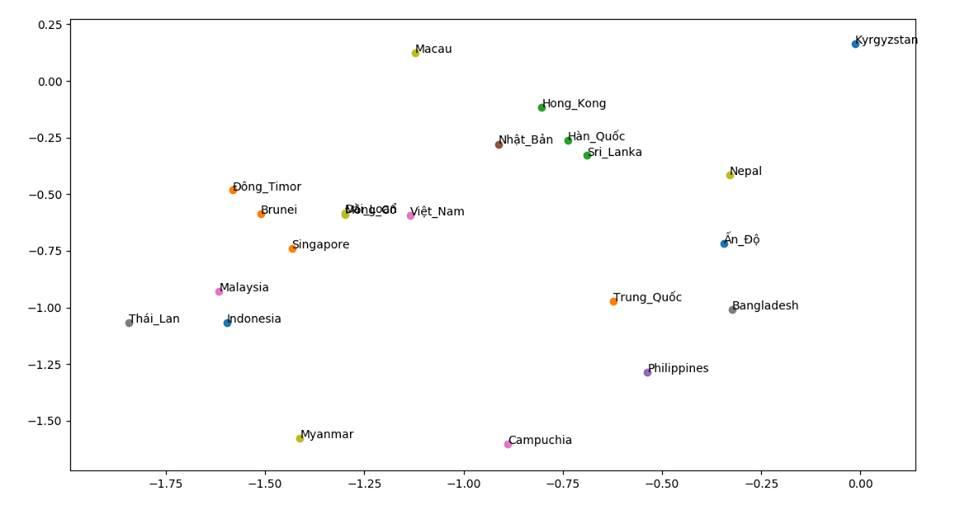 Một project vui khác mà mình thực hiện, để khám phá độ tương đồng về văn hóa các quốc gia trên thế giới. Dữ liệu training bao gồm 350.000 bài báo quốc tế được thu thập từ vnexpress. Kết quả cho thấy sự tương đồng về văn hóa giữa các quốc gia cũng được phân cụm gần tương tự với vị trí địa lý.