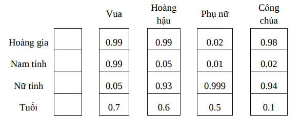 Nếu ta gán nhãn các thuộc tính cho một vector từ giả thiết, thì các vector được biểu diễn theo word2vec sẽ có dạng như sau: