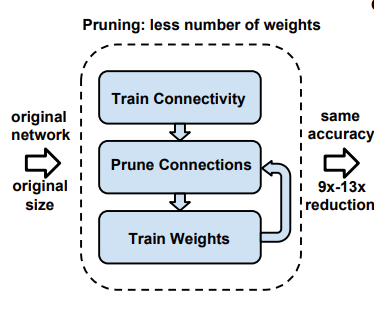 Network pruningkhông phải là một khái niệm mới mẻ, nhất là đối với các cháu làm việc nhiều với các mô hình Deep Learning. Thực ra việc dropout mà các cháu thường sử dụng trong quá trình training cũng là một dạng cắt tỉa để tránh hiện tượng overfit. Tuy nhiên việc cắt tỉa ứng dụng trong mô hình nén thì là một khái niệm không hẳn giống với dropout. Nếu như dropout sẽ bỏ ngẫu nhiên một tỉ lệ phần trăm số lượng kết nối giữa các layer trong quá trình training thì khái niệm Network pruning ở đây tức là tìm các connection không cần thiết trong mạng (loại bỏ đi cũng không ảnh hưởng nhiều đến độ chính xác) để cắt tỉa đi. Thuật toán này có thể được thực hiện qua ba bước như sau: