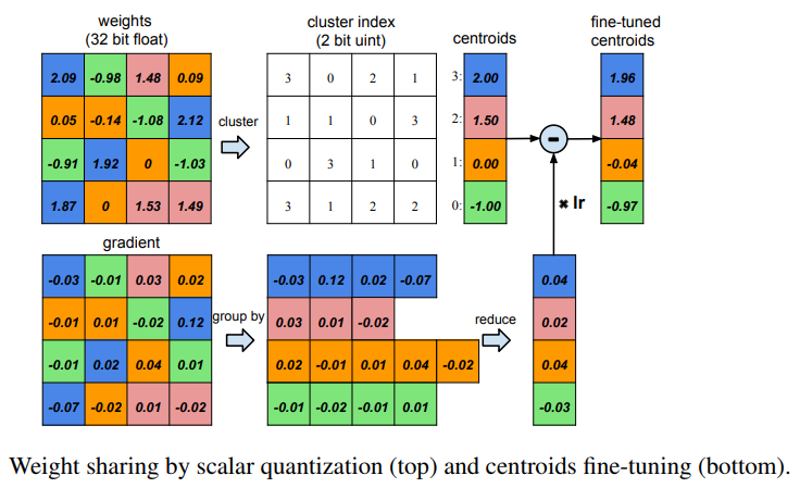 Sau khi đã nén được mô hình bằng phương pháp cắt tỉa (Trong thí nghiệm dưới của ông nó giảm đến 90% so với mạng lúc đầu). Chúng ta sẽ sử dụng một kĩ thuật gọi là lượng tử hóa để giảm số lượng các bit cần thiết trong quá trình lưu trữ các weight của mạng nơ ron. Nói một cách đơn giản như thế này nhé, các cháu phải nấu cơm cho một đại gia đình gồm rất nhiều thế hệ, nấu một món canh mà bố chồng thì thích cho 0.9 lít nước mắm, mẹ chồng thích cho 0.95 lít nước mắm còn chồng thì thích cho 1 lít nước mắm. Nếu mà nấu như vậy thì chắc sẽ rất mất công nên các cháu chỉ cần chọn một lượng nước mắm vừa đủ cho cả nhà ăn và con số 0.95 lít nước mắm (theo sở thích của mẹ chồng) là cân bằng và khéo léo hơn cả. Đây là quy tắc chọn đánh giá đại diện và cũng là tư tưởng chính của việc lượng tử hóa và share weight. Đây là quá trình chia toàn bộ số lượng weight của một layer thành các cụm nhỏ (clusters) và mỗi cụm sẽ được chia sẻ chung một giá trị weight. Giá trị này thường là giá trị tâm cụm (centroid) thể hiện được đặc trựng nhất của cụm đó. Điều ày cũng giống như việc các cháu chọn mẹ chồng làm trung tâm của gia đình đó các cháu ạ. Để hình dung rõ hơn thì mời các cháu xem hình dưới đây: