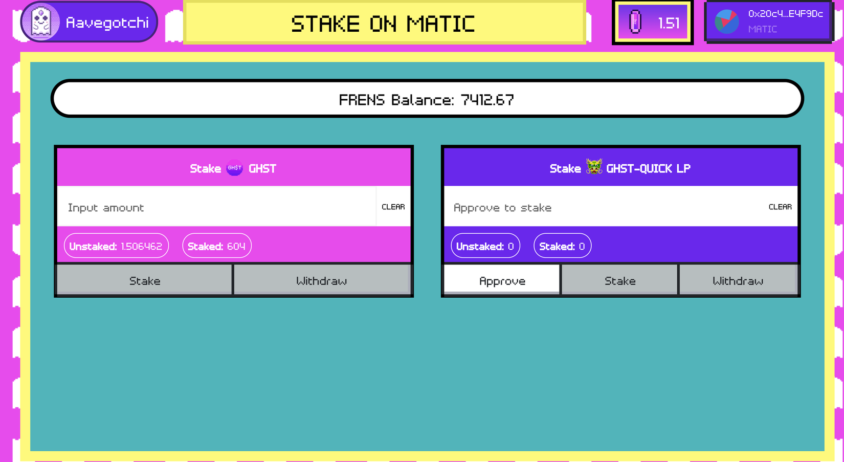 Lượng FRENS sinh ra 1 ngày sẽ tương ứng với lượng GHST chúng ta stake với cả Ethereum và Polygon (Matic).