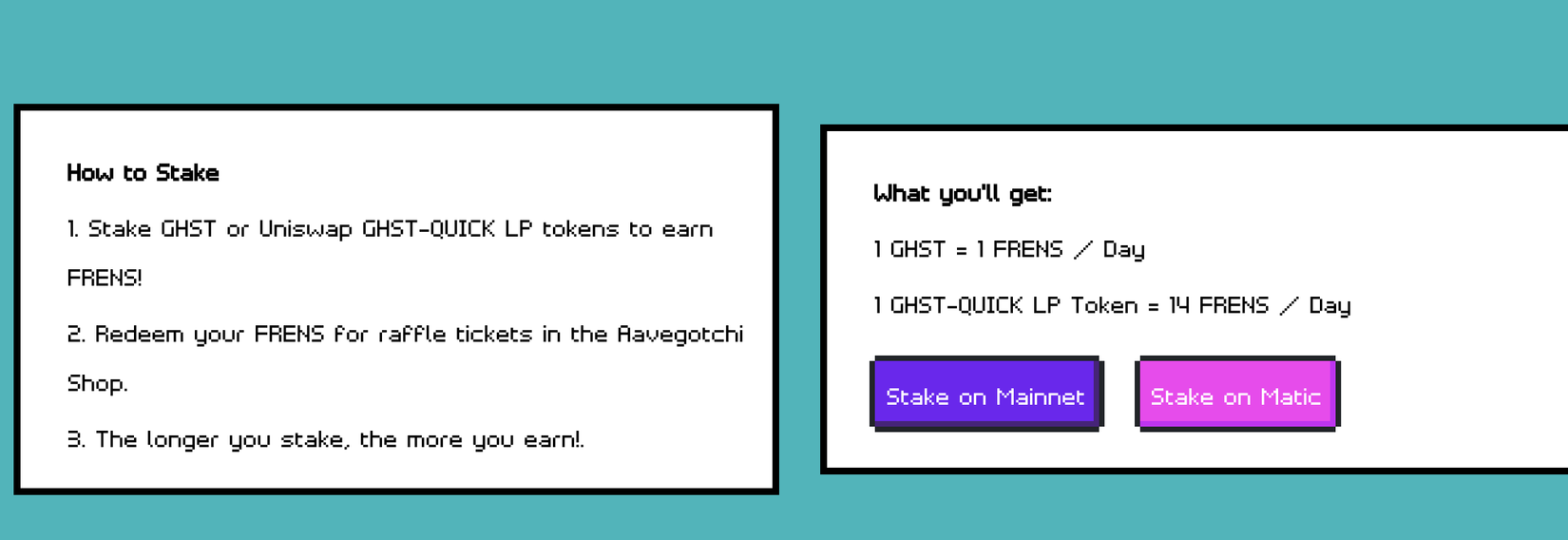 Với những holder GHST , thay vì để đấy họ có thể stake GHST để sinh ra FRENS (ERC20 nhưng không có khả năng trading). Có rất nhiều cách có thể tối ưu lượng FRENS sinh ra: