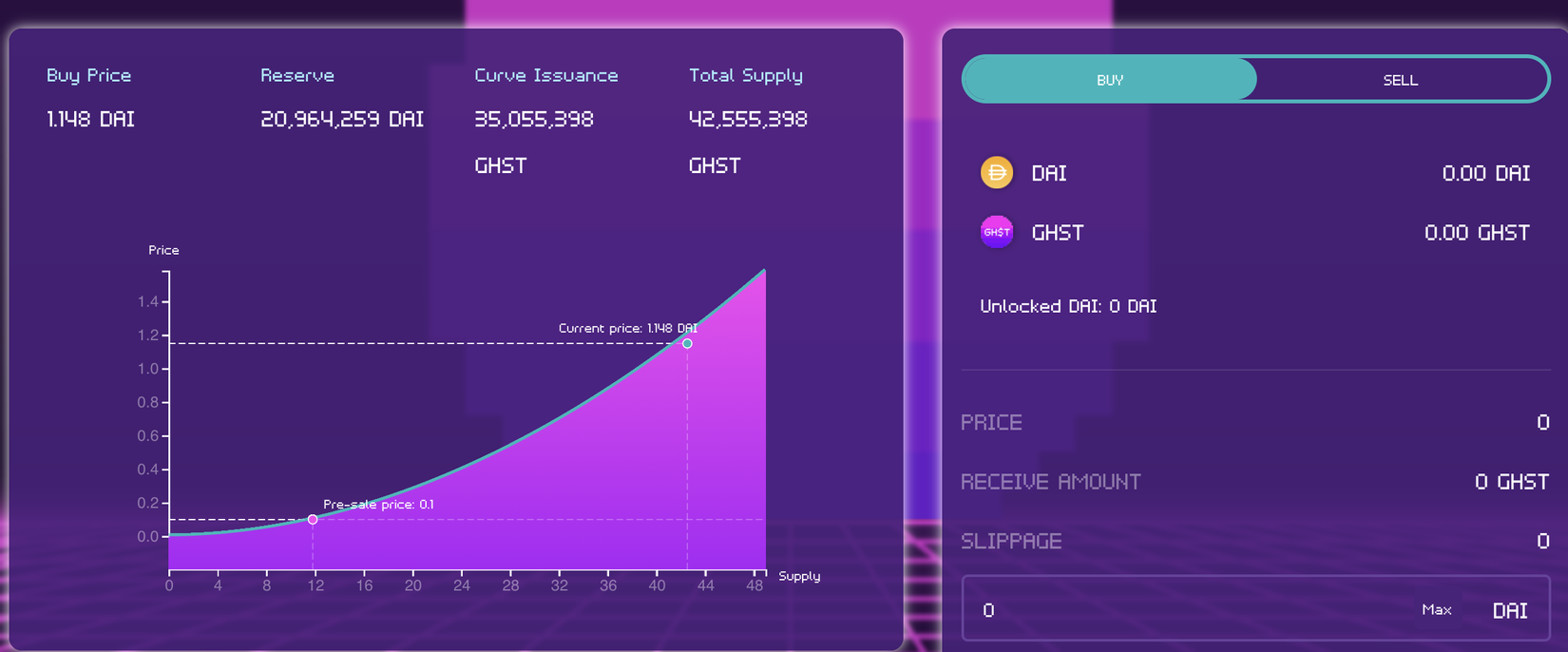 Token Bonding curve (TBC) được hiểu rằng nó sẽ làm cho giá của token (GHST) tăng lên khi lượng cung tăng và giảm khi lượng cung giảm. Có thể hiểu là nếu càng nhiều người mua thì giá trị token sẽ ngày một tăng và những người mua đầu sẽ có lợi nhất.