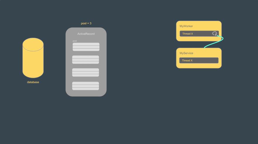 Hãy nhớ lại rằng, mình đã đề cập đến với mỗi process ActiveRecord sẽ được assigns x connection đã được config trong file database.yml. Mỗi connection sẽ được thực hiện bởi một thread. Nếu như số concurrency của sidekiq bằng với giá trị pool, thì sẽ không có vấn đề gì. Nhưng nếu như một cái gì đó tạo ra một thread mới và gọi đến database trong quá trình thực thi, thì đó chính là trường hợp mà mình đã đề cập trong ví dụ trên ở class MyService.