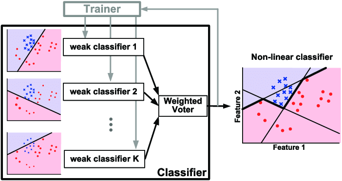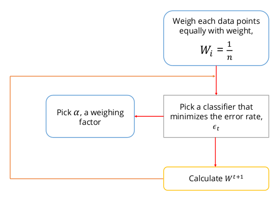 Tại mỗi vòng lặp, chọn weak-learners , tối thiểu hóa tổng trọng số các điểm bị phân loại sai , sau đấy tính tỉ lệ lỗi , dùng để tính trọng số cho weak-learners thứ t , cuối cùng dùng kết quả vừa tính được để cải thiện output