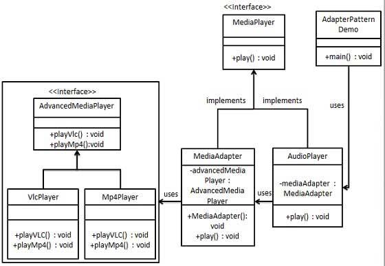 Chúng ta muốn tạo AudioPlayer để chơi các định dạng khác. Để đạt được điều này, chúng tôi đã tạo một class MediaAdapter, nó implements the MediaPlayer interface và sử dụng các đối tượng AdvancedMediaPlayer để chơi định dạng bắt buộc.