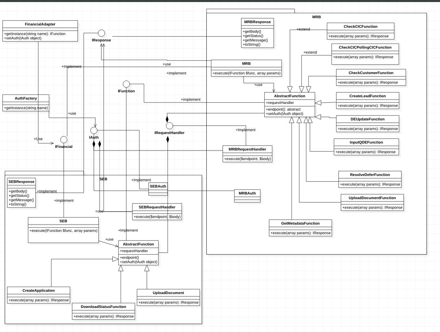 - FinancialAdapter <= Cái này sẽ giúp ta tạo ra action với MRB, SEB, vv.. thông qua 1 interface, xài Adapter pattern ở đây được nè. Sẽ có phương thức là: getInstance('bank_name_here')