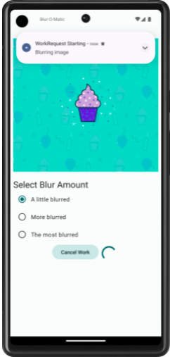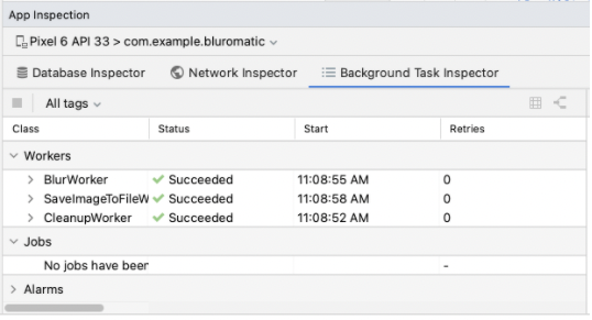 - Liệu WorkRequest đã được finish và bất kỳ data output từ Work Những method này sẽ trả về LiveData. Bạn có thể convert nó vào trong một Flow của [WorkInfo] (http://d.android.com/reference/androidx/work/WorkInfo) bằng cách gọi .asFlow() Cuối cùng bạn chỉ quan tâm tới image sau khi đã được lưu lại, bạn add một tag tới WorkRequest SaveImageToFileWorker để bạn nhận về WorkInfo của nó từ method getWorkInfosByTagLiveData(). Một cách khác có thể sử dụng method getWorkInfosForUniqueWorkLiveData() để trả về thông tin của tất 3 WorkRequest (CleanupWorker, BlurWorker, và SaveImageToFileWorker). Nhược điểm của method này là bạn cần bổ sung code để tìm cụ thể thông tin của SaveImageToFileWorker.