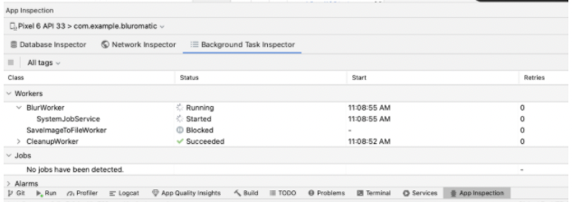 Bây giờ bạn hãy run app và click vào button Start Bạn hãy mở cửa số Background Task Inspector (View > Tool Windows > App Inspection sau đó chọn tab Background Task Inspector). Nhìn thấy các trạng thái khác nhau tương ứng với trạng thái UI đang được hiển thị. SystemJobService là thành phần chịu trách nhiệm quản lý các Worker được thực thi. Trong khi các worker đang chạy, UI hiển thị button Cancel Work và circle progress indicator.