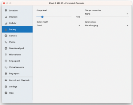 Trên emulator , thay đổi Charge level trong Extended Controls tới 15% hoặc lower để mô phỏng trạng thái battery của device ở chế độ thấp.