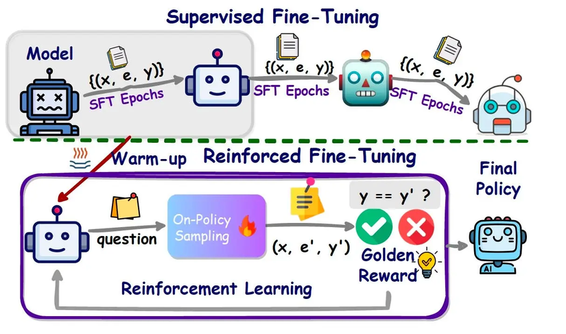Oke thì Reinforcement Fine Tuning (RFT) được giới thiệu bởi OpenAI, thiết kế với mục đích fine tune model đã có sẵn để làm những nhiệm vụ phức tạp, nhưng kiến thức chuyên sâu.
