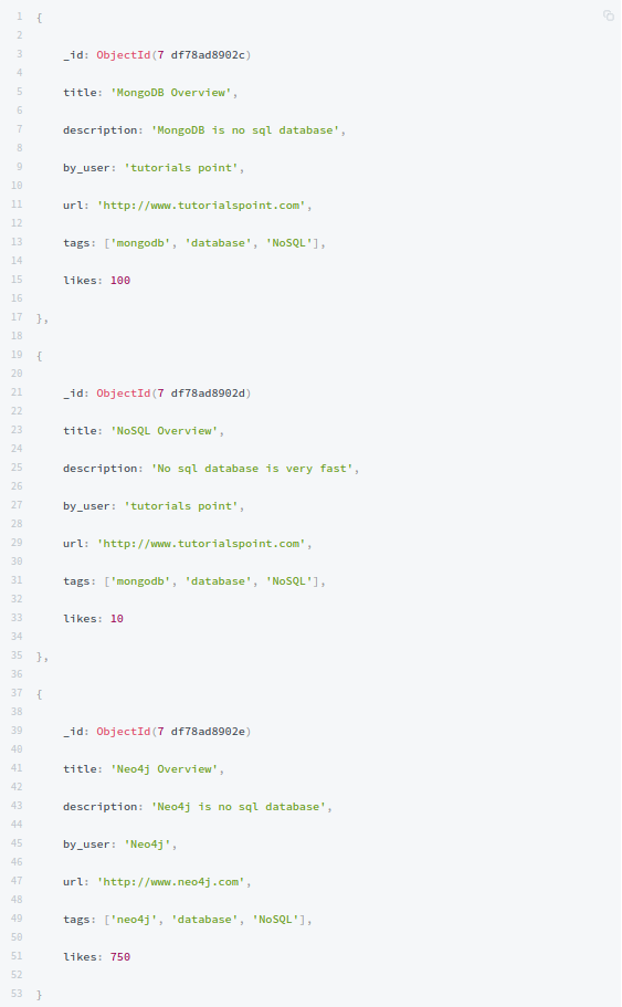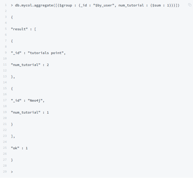 Từ Collection trên, nếu bạn muốn hiển thị một danh sách có bao nhiêu bài hướng dẫn được viết bởi mỗi người dùng, thì bạn sẽ sử dụng phương thức aggregate() như sau: