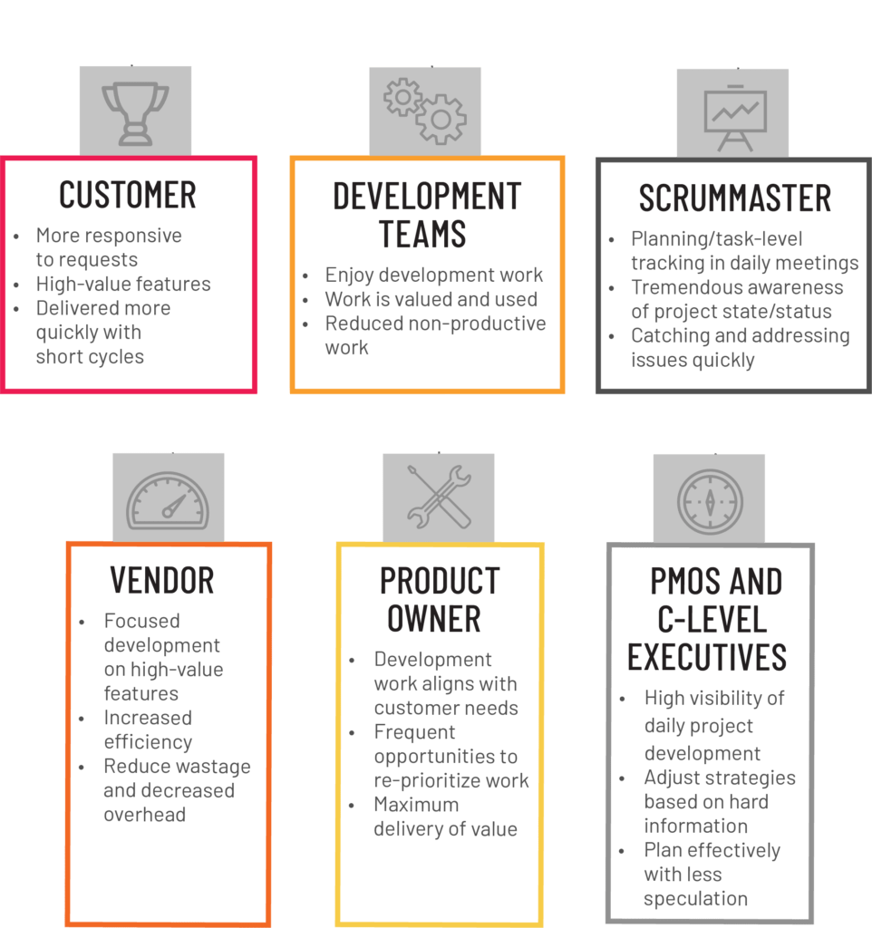 - Khách hàng nhận thấy rằng nhà cung cấp phản hồi nhanh hơn với các yêu cầu phát triển. Các tính năng có giá trị cao được phát triển và phân phối nhanh hơn với chu kỳ ngắn, so với chu kỳ dài hơn được các quy trình “thác nước” cổ điển ưa chuộng.