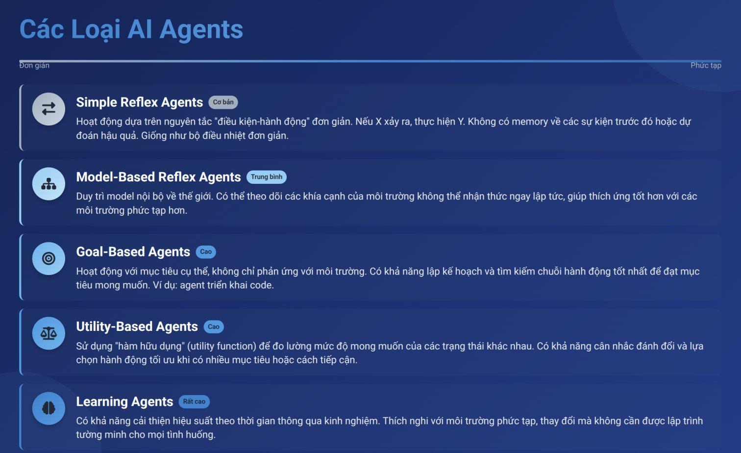 Learning Agents: Đây là nơiagentstrở nên thực sự "tự phát triển".Learning agentscó thể cải thiện hiệu suất theo thời gian thông qua kinh nghiệm, phản hồi của user. Chúng thường có các thành phần riêng biệt: mộtperformance elementđưa ra quyết định dựa trên kiến thức hiện tại, mộtlearning elementcập nhật kiến thức này dựa trên phản hồi, mộtcriticđánh giá hành động, và đôi khi là mộtproblem generatorđề xuất các hành động khám phá. Điều này cho phép chúng hoạt động hiệu quả trong các môi trường phức tạp, thay đổi liên tục mà không cần được lập trình tường minh cho mọi khả năng.