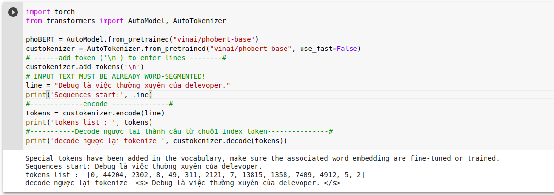 - Tokenizer và model PhoBERT