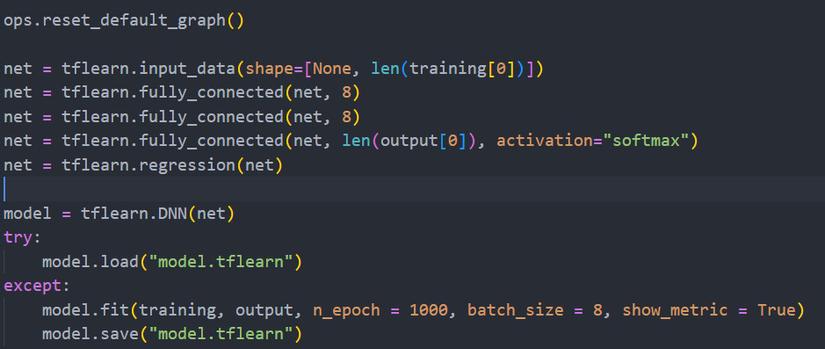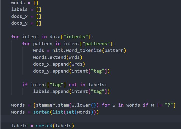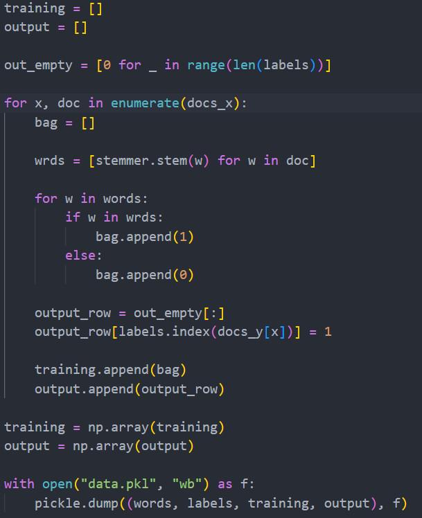 Nếu tệp đó không tồn tại nó sẽ tạo một tệp mới bằng cách bằng cách lặp qua tập dữ liệu gồm các "intents" được xác định trước. Mã này cũng tạo danh sách "tài liệu" đầu vào và "nhãn" đầu ra bằng cách liên kết từng mẫu với thẻ mục đích tương ứng của nó.