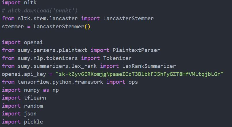 Đoạn code trên sẽ bao gồm các thư viện sẽ sử dụng trong chatbot. Trước tiên chatbot sẽ thử mở tệp đã được đào tạo sẵn từ những lần trước đó để tiết kiệm thời gian.