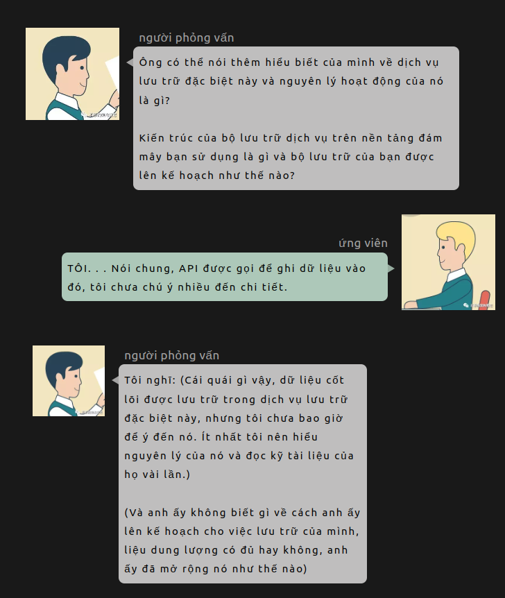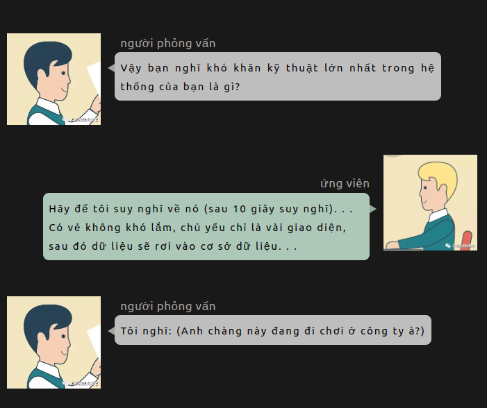 Thực tế bạn này nền tảng kỹ thuật không tồi, bao gồm một số kiến thức cơ bản về kỹ thuật, vì vậy vòng phỏng vấn đầu tiên và thứ hai đều vượt qua. Nhưng góc độ kiểm tra của vòng phỏng vấn thứ ba hoàn toàn khác nhau, ngay lập tức bộc lộ ra những khuyết điểm về năng lực của bạn ấy.
