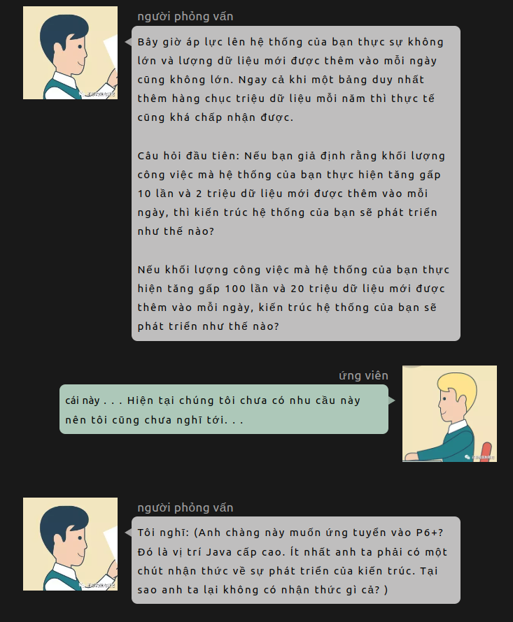 Thực tế đánh giá của phỏng vấn viên P9 đó là mong đợi ứng viên nói ra kiến trúc này. Mặc dù cấp bậc P6+ chưa chắc có khả năng hoàn toàn kiểm soát được kiến trúc này, nhưng ít nhất phải có ý thức.