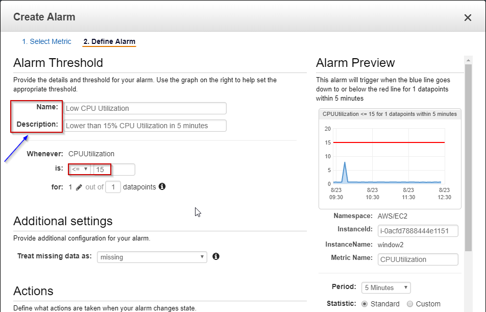 Bước 2 : Tạo một alarm để thông báo khi metric CPU Utilization của instance đạt ngưỡng thấp hơn 15%