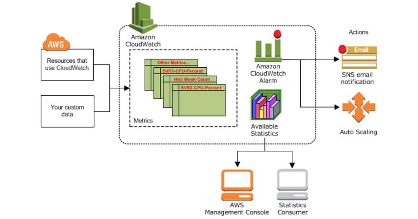 Amazon CloudWatch có khả năng theo dõi các tài nguyên và ứng dụng AWS của bạn trên toàn hệ thống. Nó sẽ giám sát các tệp tài nguyên của bạn và tạo các key metric dựa trên log ứng dụng của bạn. Các key metric này bao gồm CPU usage, CPU latency, network traffic, disk storage, v.v. Dựa trên các metric này, CloudWatch cung cấp một bản tóm tắt thời gian thực về hoạt động của hệ thống và các tài nguyên riêng lẻ.