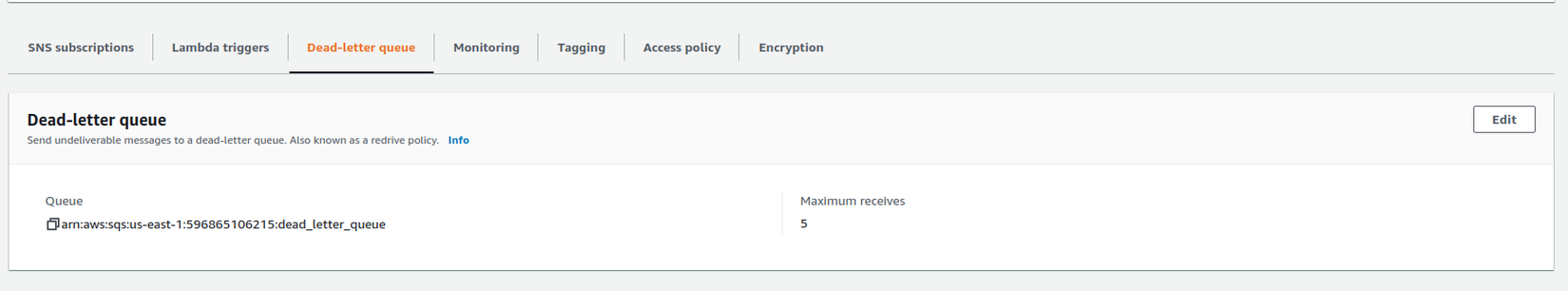- Với AWS console UI, chúng ta tạo một queue mới là dead_letter_queue chẳng hạn, sau đó vào edit queue chính, chọn enable dead letter và select queue dead_letter_queue là xong (easy).