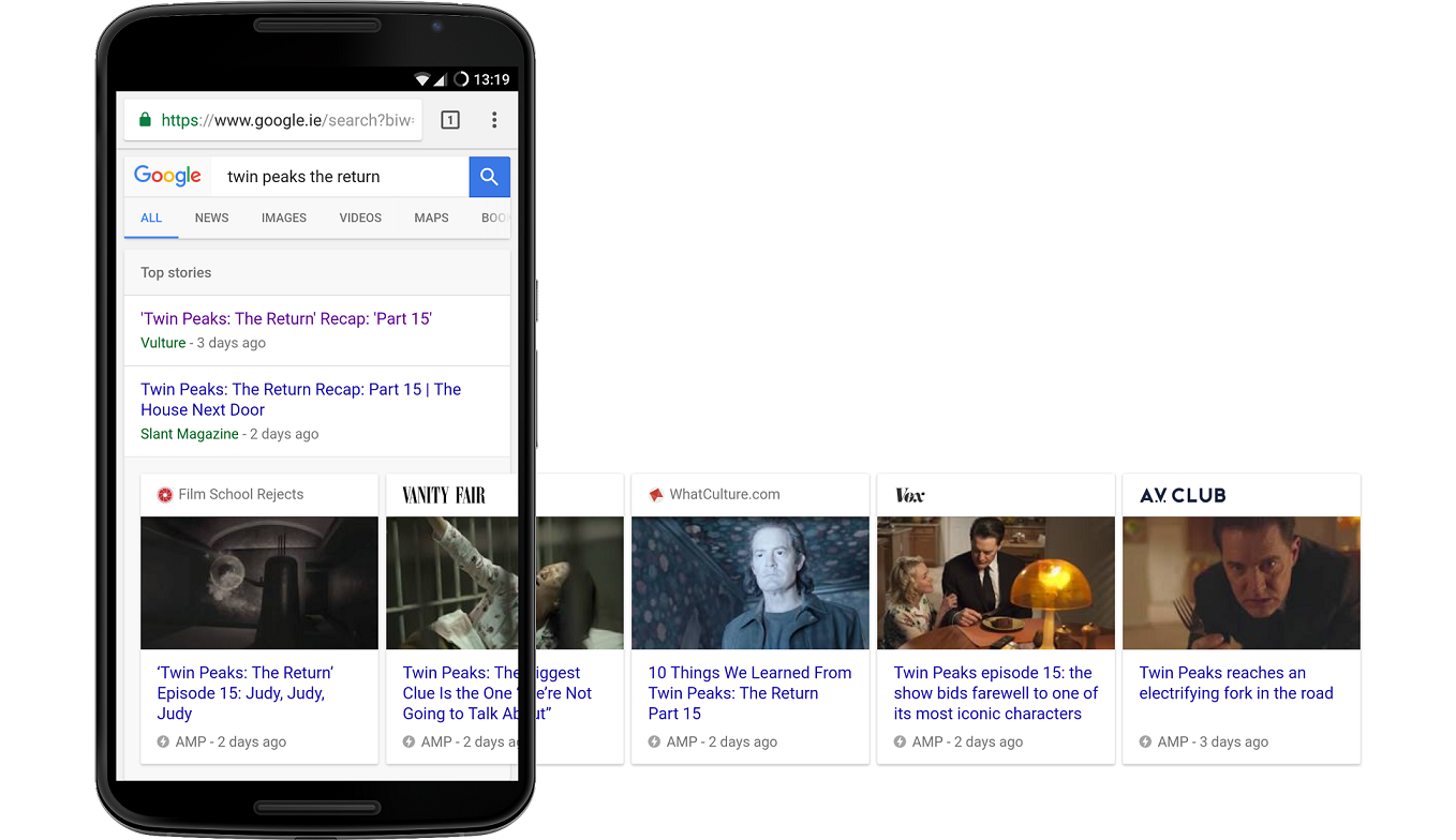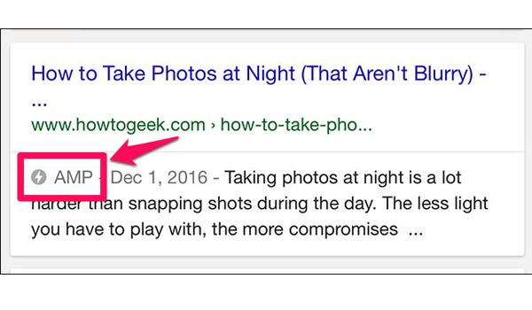 Khi người dùng tìm kiếm kết quả trên thiết bị di động, các website có Google AMP sẽ xuất hiện trên kết quả tìm kiếm của Google biểu tượng tia sét và dòng chữ AMP bên cạnh đường link. Chẳng hạn như ví dụ dưới đây: