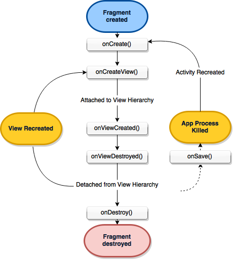 Đôi khi chúng ta có những object mà dữ liệu tồn tại (lives) trong suốt thời gian tồn tại của Fragment. Chúng ta nghĩ rằng chúng ta có thể tạo nó trong onCreateView, vì điều này sẽ được gọi một lần khi Fragment được tạo hoặc khi Fragment được khôi phục từ trạng thái bị killed.