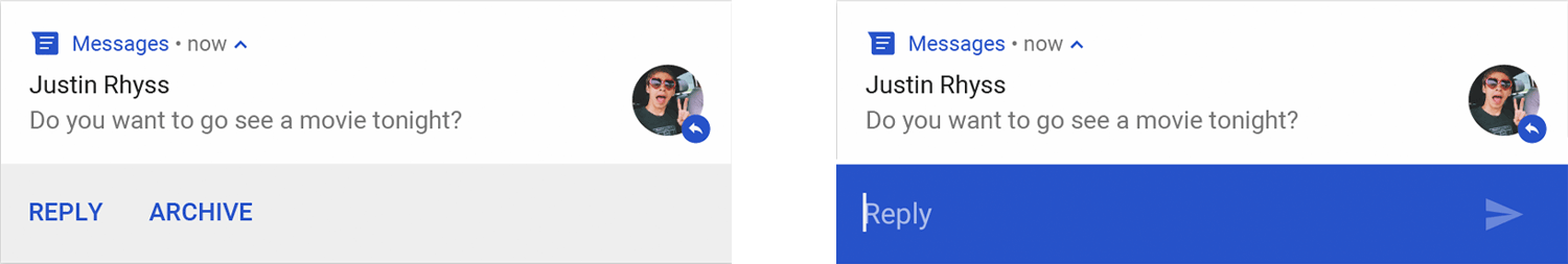 Hành động trả lời trực tiếp xuất hiện dưới dạng một nút bổ sung trong thông báo. Khi người dùng nhập xong, hệ thống sẽ đính kèm phản hồi văn bản với Intent mà bạn đã chỉ định cho hành động thông báo và gửi Intent đến ứng dụng.