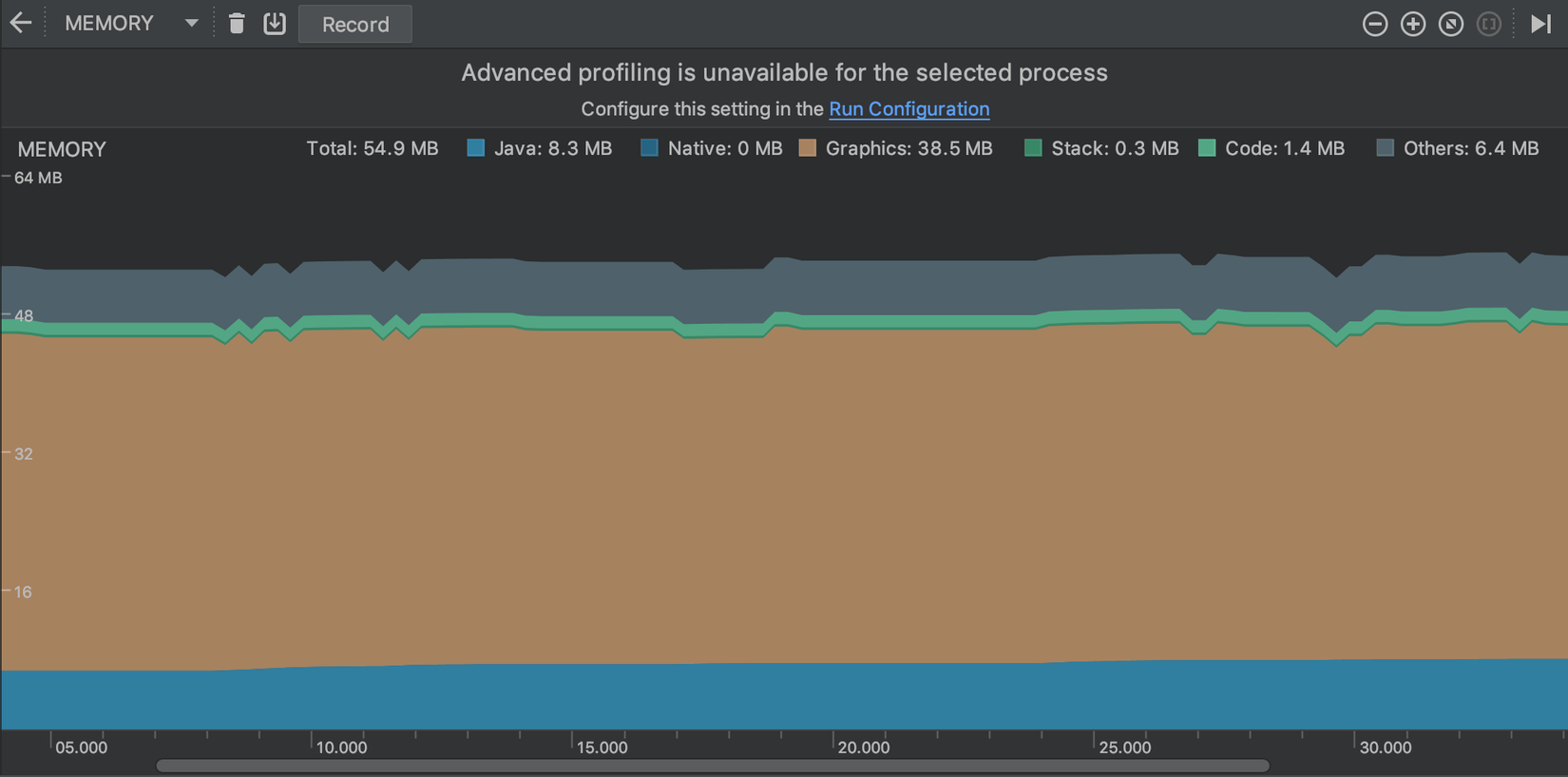 Click vào phần Memory để xem chi tiết số liệu sử dụng bộ nhớ , Android Profiler cung cấp một cái nhìn tổng quan trực quan về việc sử dụng bộ nhớ theo thời gian.