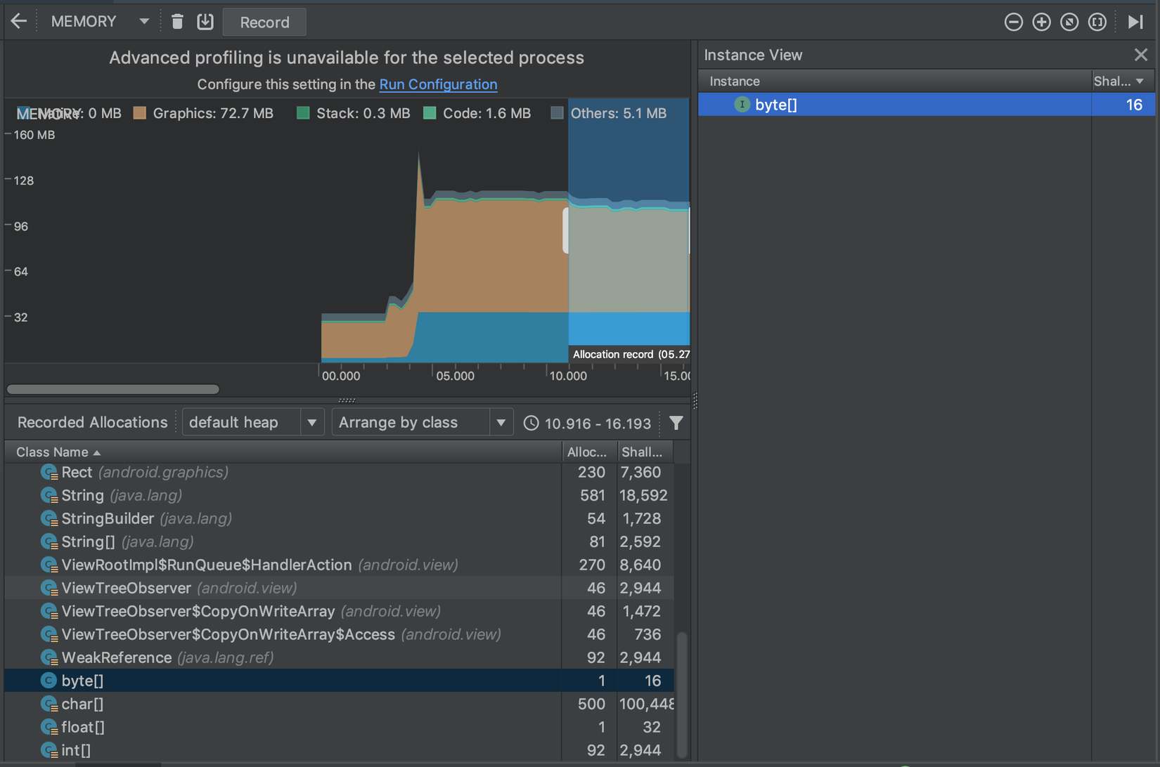 Nhấp vào nút Record trong Memory Profiler, scroll RecyclerView một lúc và nhấp vào nút dừng. Profiler sẽ hiển thị cho bạn một danh sách sử dụng bộ nhớ chi tiết được phân loại theo loại đối tượng.