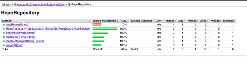 Như class RepoRepository,  ở đây JaCoCo chỉ ra rằng các func nào đã được coverage và được coverage bao nhiêu %. Cụ thể chúng ta chưa viết func loadRepos(String) cho nên class này chỉ coverage được 89%.