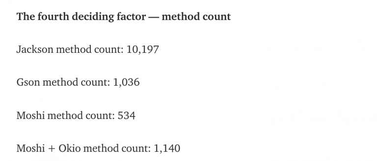Chưa kể, số lương method (phương thức) của Jackson cao hơn nhiều so với của Gson hoặc Moshi. Danny Damsky đã đưa ra ý kiến này trong bài báo của mình, vì vậy chúng ta sẽ xem xét nó trong hình bên dưới.