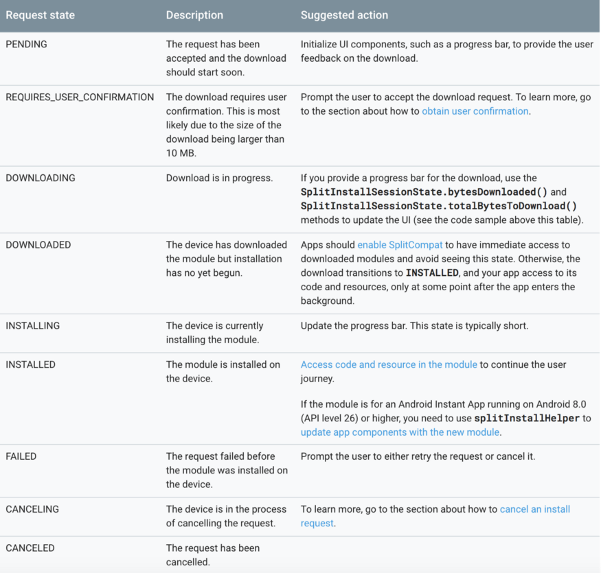 SplitInstallManager.deferredInstall(). Nếu bạn muốn cài đặt Dynamic Feature Modules khi app ở dưới background thì bạn cần sử dụng đến cách thứ 2 này. Khi sử dụng deferredInstall bạn không thể theo dõi được tiến trình tài về hay cài đặt, vậy nên bạn cần kiểm tra trước xem Module đã được tải về hay chưa trước khi yêu cầu cả Module đó.
