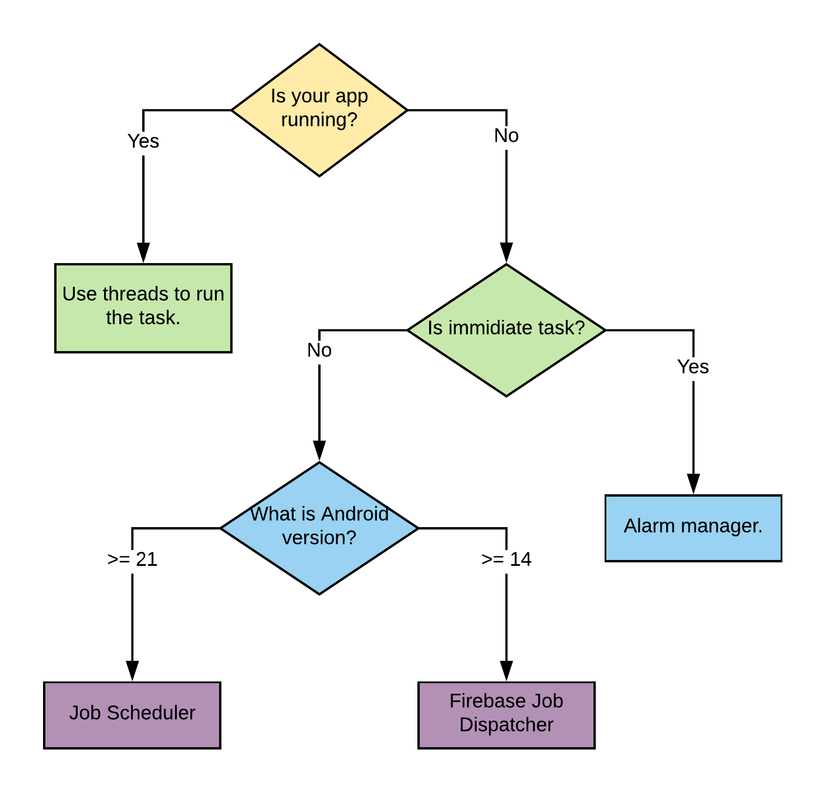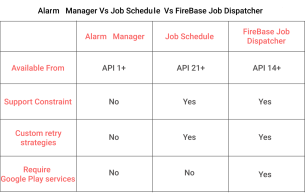 Nhìn vào bảng trên, chúng ta có thể thấy. Để giải được bài toán ở hình 1 chạy tốt trên mọi nền tảng (minSdk = 17) thì chúng ta phải kết hợp nhiều class lại (Alarm Manager + Jobs + Firebase Job Dispatcher). Nghĩ tới là thấy code rối như thế nào rồi =))
