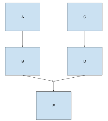 Trong trường hợp này, WorkManager chạy workA xong rồi đến chạy workB. Nó cũng chạy workC xong rồi đến chạy workD. Sau khi cả hai chuỗi công việc chain1 và chain2, WorkManager mới bắt đầu chạy workE.